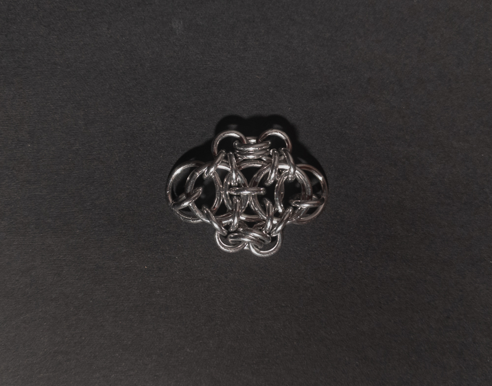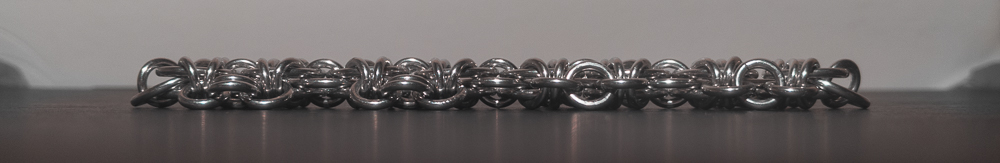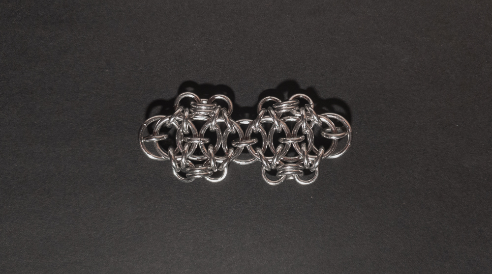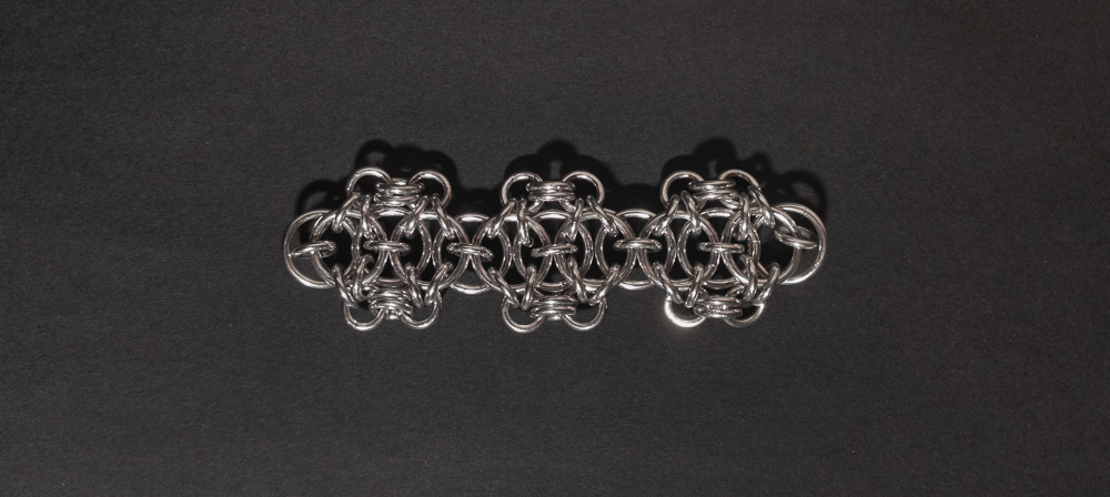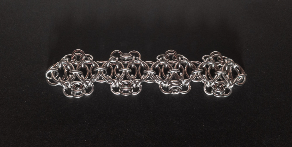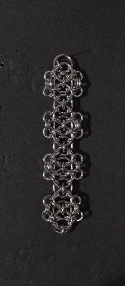 The Camelot weave is fairly easy to understand and not difficult to create, although it requires a large number of rings: 20 for the first unit and 18 for each additional unit. I find this weave very aesthetically pleasing. As a band weave, it works well for bracelets, chokers, and strapping; however, it is a bit stiff and cannot comfortably bend around areas with a radius smaller than about 1.3 inches (3.3 cm). You may be able to improve flexibility by experimenting with different ring sizes. While the weave has a pleasing appearance, its stiffness and high ring usage make it hard to recommend unless you really like how it looks and don’t need it to be very flexible.