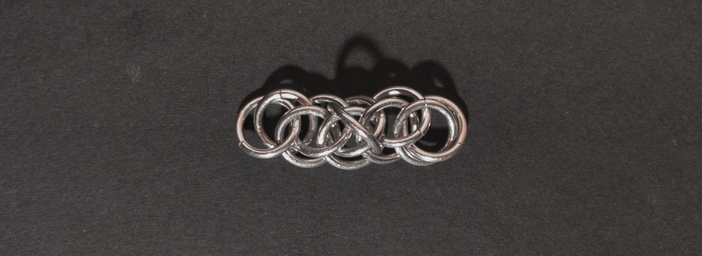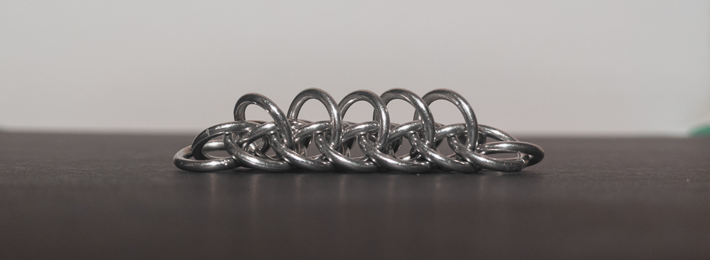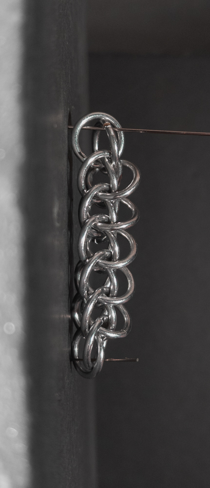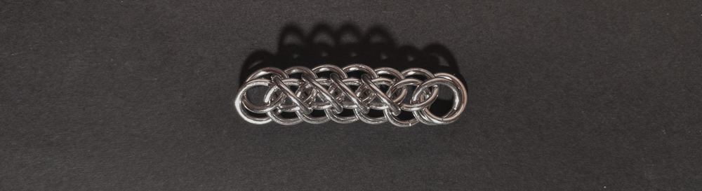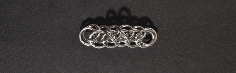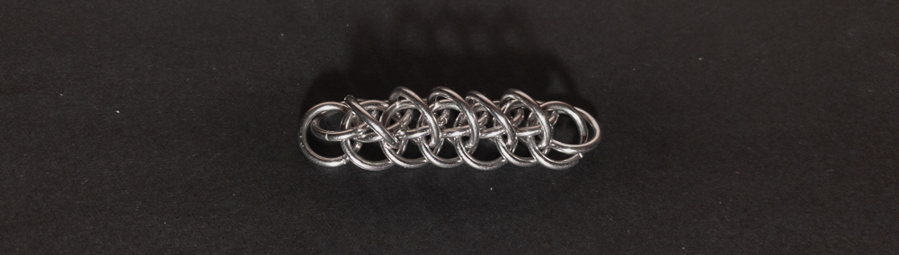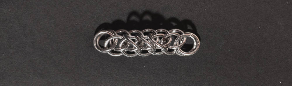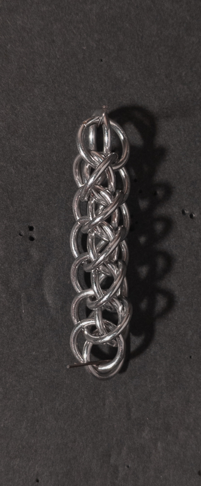 The weave is fairly simple to understand and create. However, you should pay attention to the placement of the ‘feather’ rings in relation to the Half Persian 3-in-1 chain. When the placement of the ‘feather’ rings is consistent, the weave looks good; when they aren’t, it looks messy. As a chain weave with a flat side, it works well for bracelets, necklaces, and chokers, though the somewhat spiky opposite side makes it less suitable for use as a cord. If you like the spiky look and want to enhance it, I would modify the weave by skipping every other ‘feather’ ring so each one stands out more. While making the weave, I recommend waiting until you are happy with the length of the weave before adding ‘feathers’ to the edges. I suggest this since it is harder to extend the Half Persian 3-in-1 core with the ‘feather’ ring in the way. You can see this in the In Process photos below. Overall, this weave is easy to learn/make, looks good, and has a fun name, so I recommend giving it a try.