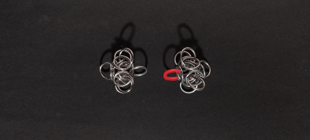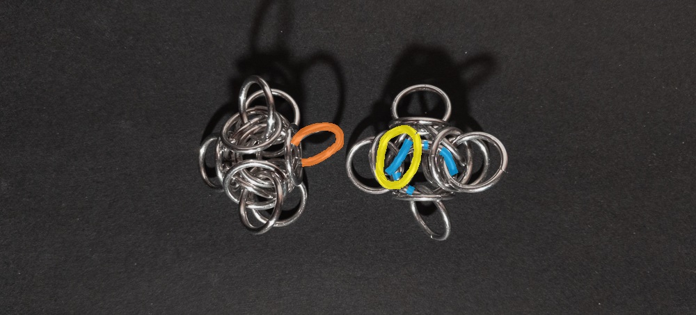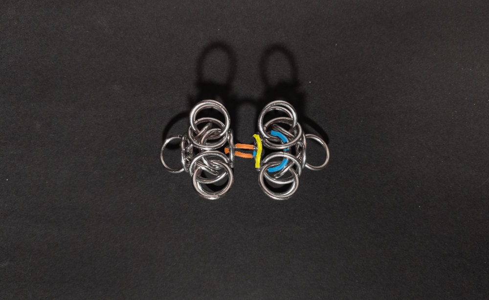 Join the new Tetra Orb to your chain by weaving the outermost ring on the side you are extending your chain (orange in the image below) through the same rings the ring you removed in the previous step went through (blue in the image below). Make sure to keep the orbital ring (yellow in the image below) in place, as it no longer orbits a connection: