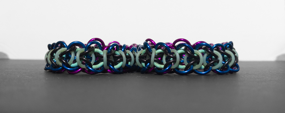 About two years after starting this blog, I had become quite comfortable making chainmail and wanted to make a gift for a good friend. I chose Spinal Elf because the recipient liked its base weave (Elfweave), it was a stable weave, I could cleanly use multiple colors, and it could form a closed loop for the bracelets. In my (and the recipient’s) opinion, the set looks nice, and while it may not be worn frequently as a whole set (apparently, the necklace is a bit much for casual wear), they wear the bracelets daily.