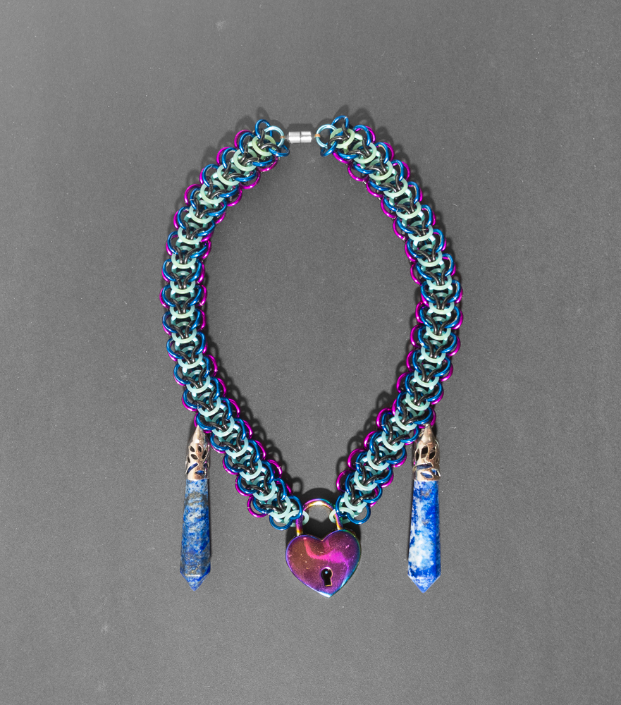 This project also included several firsts for me. It was my first time using a magnetic clasp instead of a lobster hook or a solid loop. The clasp has performed quite well; it has never come loose during casual wear and only came apart after deliberate and vigorous testing. It was also my first time incorporating a semi-precious stone, using lapis lazuli points attached to the outward-facing spinal rings of the necklace. These stones added a fun visual element and were more affordable than I had anticipated. For the earrings, I initially used French hooks; after receiving a few complaints and later finding leverback earrings at Michaels, I replaced them, which changed those complaints to compliments.